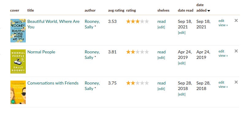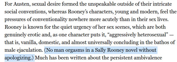 It’s not a content thing, I’m not so literal. I’ve read more about less. A Sally Rooney cam girl is light work compared to, say, Rejection by Tony Tulathimutte, the last thing I read. One of the stories is punctuated by a 4,000-word description of a custom-order porn video. I had to put the book down a few times because it was so wrenchingly visceral, unlike the hot, Xanned-out, woe-is-me Intermezzo lawyer. Tulathimutte reminded me that, oh right, you can write whatever you want, however you want, in the weirdest way possible. For now, I will suffer through another sadsack cast of characters3 and absorb some vague gesturing about Marxism to participate in the zeitgeist.